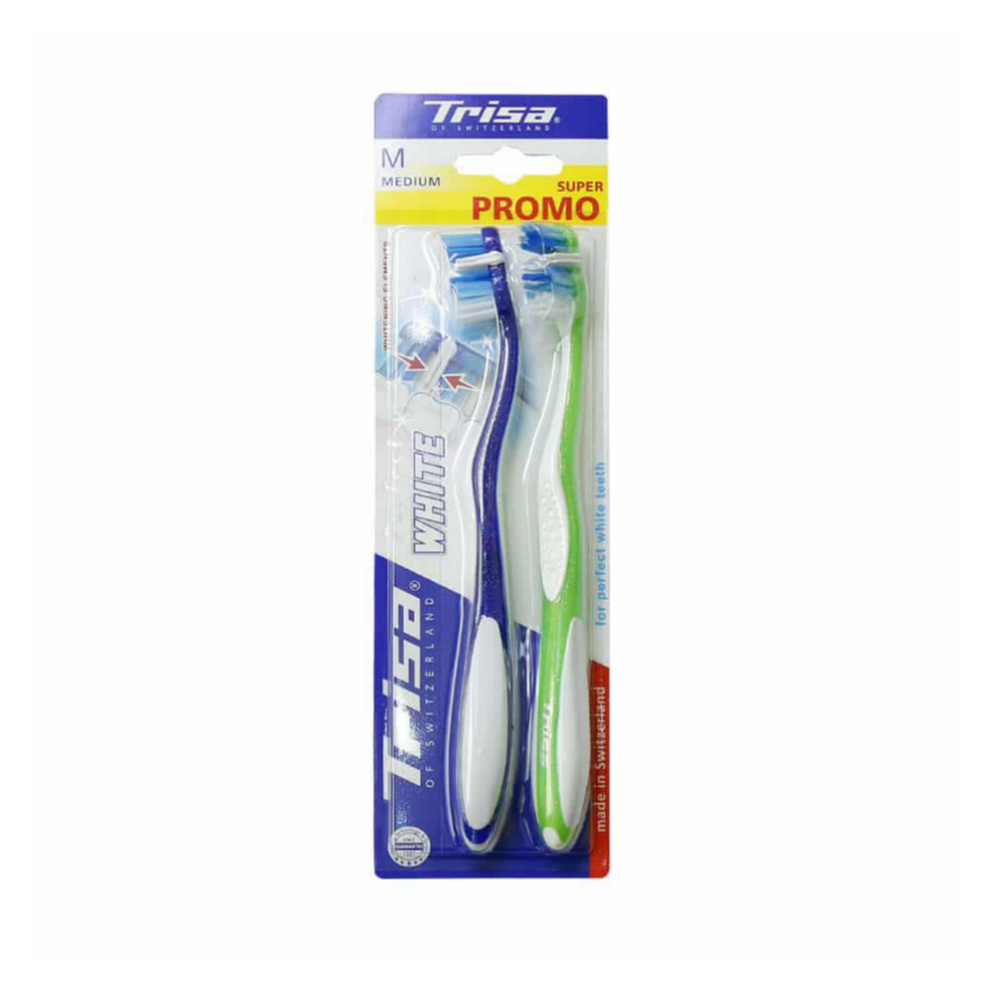 مسواک دوتایی پرفکت وایت با فرچه متوسط تریزا دارای الیاف اسفنجی با خاصیت سفید کنندگی و ماساژ لثهها، همچنین الیاف بلند برای حذف پلاکها و از بین زردی دندان است. این مسواک به حفظ سلامت دهان و دندان کمک میکندمسواک دوتایی پرفکت وایت با فرچه متوسط تریزا با طراحی خاص و زیبا به صورت یک پک دو عددی عرضه میشود. این مسواکها دارای الیاف اسفنجی و ماساژ لثهها با خاصیت سفیدکنندگی است. الیاف بلند جهت از بین بردن زردی دندان و حذف پلاکها بسیار موثر است. علاوه بر این الیاف بلند و زاویه دار این مسواک جهت تمیز کردن فضای بین دندانی استفاده میشود. یکی دیگر از مزیتهای این مسواک، وجود زبان پاک کنهای دایره ای شکل برجسته روی آن است که موجب پاکسازی پلاکهای روی زبان میشود. طراحی ارگونومیک این محصول و استفاده از مواد ضد لغزش TPE برای استفاده هر چه راحت تر از مسواک تعبیه شده است. این مسواک جهت صرفه اقتصادی دو عدد در یک بسته بندی قرار دارد.